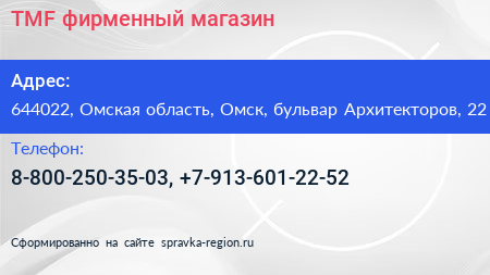 TMF, фирменный магазин по адресу 644022, Омская область, Омск, бульвар Архитекторов, 22 в дальнейшем Организация, размещена в следующих категориях: