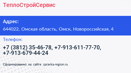 ТеплоСтройСервис по адресу 644022, Омская область, Омск, Новороссийская, 4 в дальнейшем Организация, размещена в следующих категориях: