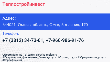 Теплостройинвест по адресу 644021, Омская область, Омск, 6-я линия, 170 в дальнейшем Организация, размещена в следующих категориях: