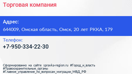 Торговая компания по адресу 644009, Омская область, Омск, 20 лет РККА, 179 в дальнейшем Организация, размещена в следующих категориях: