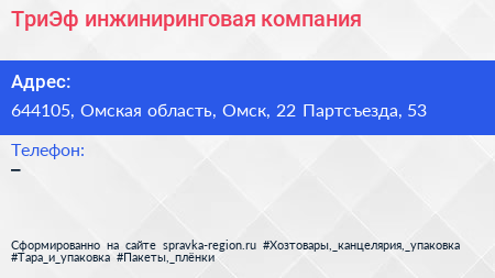 ТриЭф, инжиниринговая компания по адресу 644105, Омская область, Омск, 22 Партсъезда, 53 в дальнейшем Организация, размещена в следующих категориях: