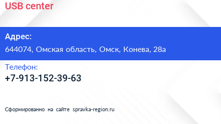 USB center по адресу 644074, Омская область, Омск, Конева, 28а в дальнейшем Организация, размещена в следующих категориях: