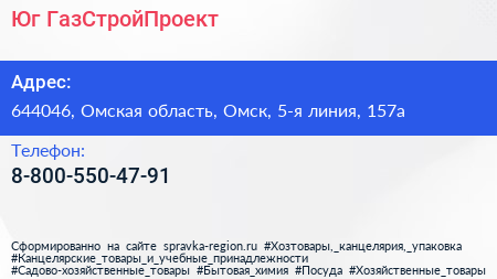 Юг-ГазСтройПроект по адресу 644046, Омская область, Омск, 5-я линия, 157а в дальнейшем Организация, размещена в следующих категориях: