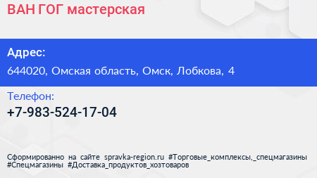 ВАН ГОГ, мастерская по адресу 644020, Омская область, Омск, Лобкова, 4 в дальнейшем Организация, размещена в следующих категориях: