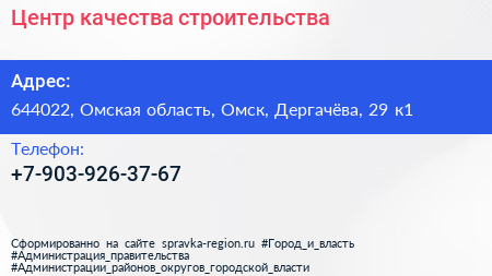 Центр качества строительства по адресу 644022, Омская область, Омск, Дергачёва, 29 к1 в дальнейшем Организация, размещена в следующих категориях: