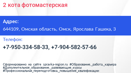 2 кота, фотомастерская по адресу 644109, Омская область, Омск, Ярослава Гашека, 3 в дальнейшем Организация, размещена в следующих категориях: