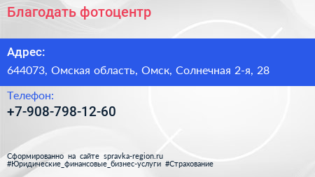 Благодать, фотоцентр по адресу 644073, Омская область, Омск, Солнечная 2-я, 28 в дальнейшем Организация, размещена в следующих категориях: