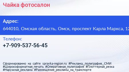 Чайка, фотосалон по адресу 644010, Омская область, Омск, проспект Карла Маркса, 12 в дальнейшем Организация, размещена в следующих категориях: