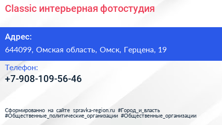 Classic, интерьерная фотостудия по адресу 644099, Омская область, Омск, Герцена, 19 в дальнейшем Организация, размещена в следующих категориях: