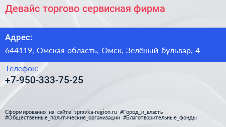 Девайс, торгово-сервисная фирма по адресу 644119, Омская область, Омск, Зелёный бульвар, 4 в дальнейшем Организация, размещена в следующих категориях:
