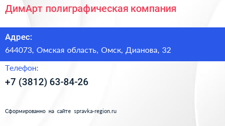 ДимАрт, полиграфическая компания по адресу 644073, Омская область, Омск, Дианова, 32 в дальнейшем Организация, размещена в следующих категориях: