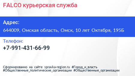 FALCO, курьерская служба по адресу 644009, Омская область, Омск, 10 лет Октября, 195Б в дальнейшем Организация, размещена в следующих категориях: