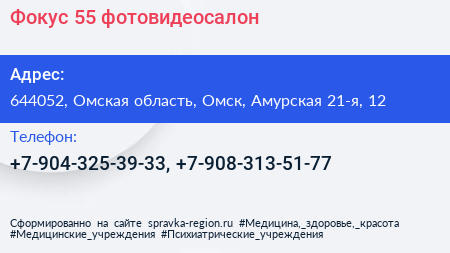 Фокус 55, фотовидеосалон по адресу 644052, Омская область, Омск, Амурская 21-я, 12 в дальнейшем Организация, размещена в следующих категориях: