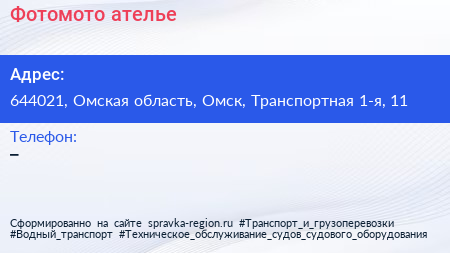Фотомото, ателье по адресу 644021, Омская область, Омск, Транспортная 1-я, 11 в дальнейшем Организация, размещена в следующих категориях: