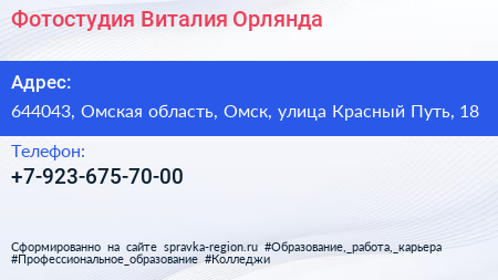 Фотостудия Виталия Орлянда по адресу 644043, Омская область, Омск, улица Красный Путь, 18 в дальнейшем Организация, размещена в следующих категориях:
