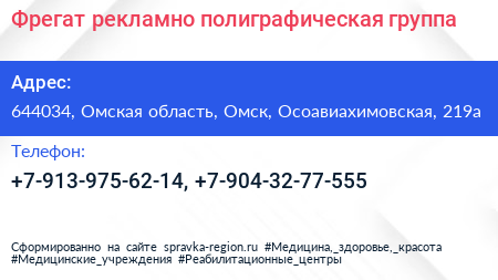 Фрегат, рекламно-полиграфическая группа по адресу 644034, Омская область, Омск, Осоавиахимовская, 219а в дальнейшем Организация, размещена в следующих категориях: