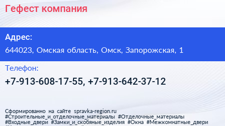 Гефест, компания по адресу 644023, Омская область, Омск, Запорожская, 1 в дальнейшем Организация, размещена в следующих категориях: