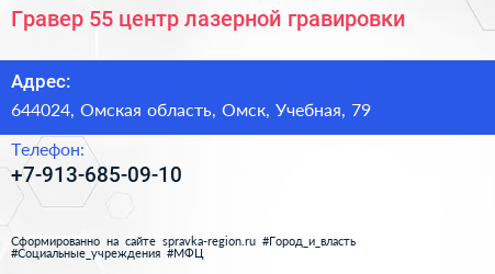 Гравер 55, центр лазерной гравировки по адресу 644024, Омская область, Омск, Учебная, 79 в дальнейшем Организация, размещена в следующих категориях: