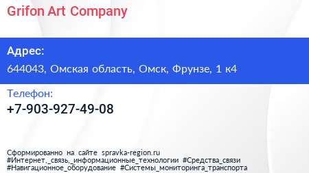 Grifon Art Company по адресу 644043, Омская область, Омск, Фрунзе, 1 к4 в дальнейшем Организация, размещена в следующих категориях: