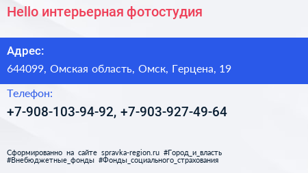 Hello, интерьерная фотостудия по адресу 644099, Омская область, Омск, Герцена, 19 в дальнейшем Организация, размещена в следующих категориях: