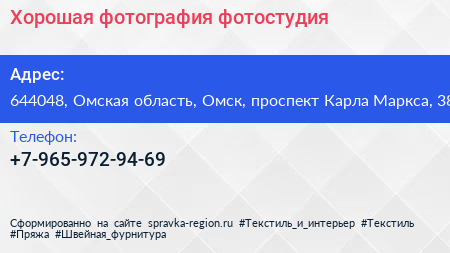 Хорошая фотография, фотостудия по адресу 644048, Омская область, Омск, проспект Карла Маркса, 38 в дальнейшем Организация, размещена в следующих категориях: