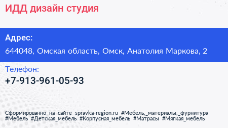 ИДД, дизайн-студия по адресу 644048, Омская область, Омск, Анатолия Маркова, 2 в дальнейшем Организация, размещена в следующих категориях: