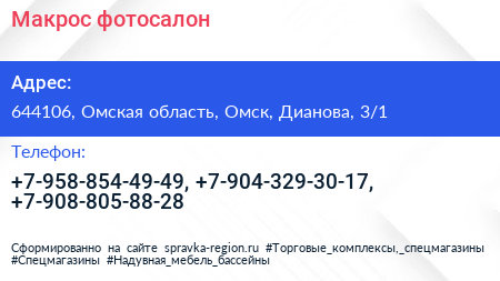 Макрос, фотосалон по адресу 644106, Омская область, Омск, Дианова, 3/1 в дальнейшем Организация, размещена в следующих категориях: