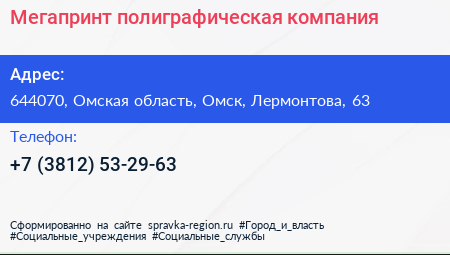 Мегапринт, полиграфическая компания по адресу 644070, Омская область, Омск, Лермонтова, 63 в дальнейшем Организация, размещена в следующих категориях: