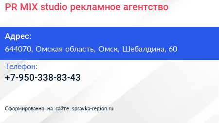 PR-MIX studio, рекламное агентство по адресу 644070, Омская область, Омск, Шебалдина, 60 в дальнейшем Организация, размещена в следующих категориях: