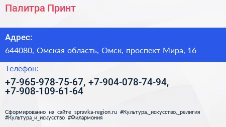 Палитра Принт по адресу 644080, Омская область, Омск, проспект Мира, 16 в дальнейшем Организация, размещена в следующих категориях: