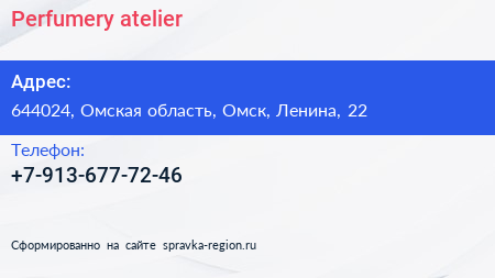 Perfumery atelier по адресу 644024, Омская область, Омск, Ленина, 22 в дальнейшем Организация, размещена в следующих категориях: