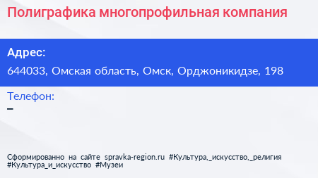 Полиграфика, многопрофильная компания по адресу 644033, Омская область, Омск, Орджоникидзе, 198 в дальнейшем Организация, размещена в следующих категориях:
