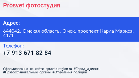 Prosvet, фотостудия по адресу 644042, Омская область, Омск, проспект Карла Маркса, 41/1 в дальнейшем Организация, размещена в следующих категориях: