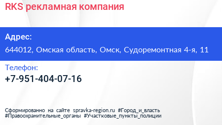 RKS, рекламная компания по адресу 644012, Омская область, Омск, Судоремонтная 4-я, 11 в дальнейшем Организация, размещена в следующих категориях: