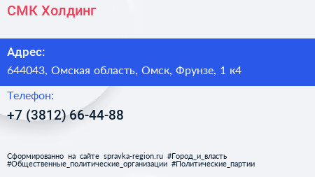 СМК Холдинг по адресу 644043, Омская область, Омск, Фрунзе, 1 к4 в дальнейшем Организация, размещена в следующих категориях: