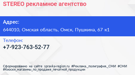 STEREO, рекламное агентство по адресу 644010, Омская область, Омск, Пушкина, 67 к1 в дальнейшем Организация, размещена в следующих категориях: