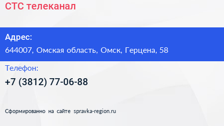СТС, телеканал по адресу 644007, Омская область, Омск, Герцена, 58 в дальнейшем Организация, размещена в следующих категориях: