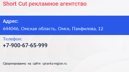 Short Cut, рекламное агентство по адресу 644046, Омская область, Омск, Панфилова, 12 в дальнейшем Организация, размещена в следующих категориях: