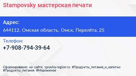 Stampovsky, мастерская печати по адресу 644112, Омская область, Омск, Перелёта, 25 в дальнейшем Организация, размещена в следующих категориях: