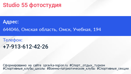 Studio 55, фотостудия по адресу 644046, Омская область, Омск, Учебная, 194 в дальнейшем Организация, размещена в следующих категориях: