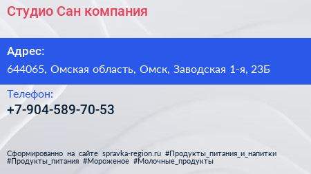 Студио Сан, компания по адресу 644065, Омская область, Омск, Заводская 1-я, 23Б в дальнейшем Организация, размещена в следующих категориях: