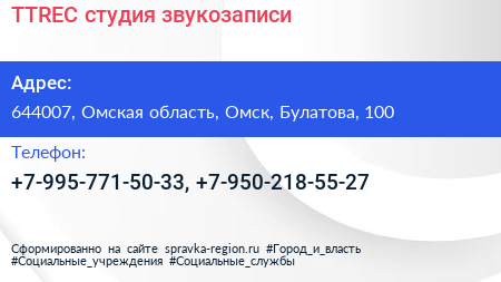 TTREC, студия звукозаписи по адресу 644007, Омская область, Омск, Булатова, 100 в дальнейшем Организация, размещена в следующих категориях: