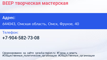 ВЕЕР, творческая мастерская по адресу 644043, Омская область, Омск, Фрунзе, 40 в дальнейшем Организация, размещена в следующих категориях: