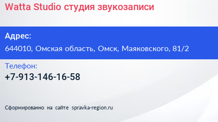 Watta Studio, студия звукозаписи по адресу 644010, Омская область, Омск, Маяковского, 81/2 в дальнейшем Организация, размещена в следующих категориях:
