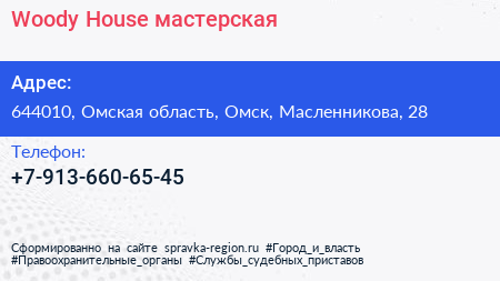 Woody House, мастерская по адресу 644010, Омская область, Омск, Масленникова, 28 в дальнейшем Организация, размещена в следующих категориях: