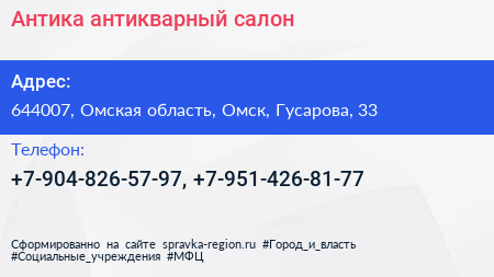 Антика, антикварный салон по адресу 644007, Омская область, Омск, Гусарова, 33 в дальнейшем Организация, размещена в следующих категориях: