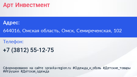 Арт Инвестмент по адресу 644016, Омская область, Омск, Семиреченская, 102 в дальнейшем Организация, размещена в следующих категориях: