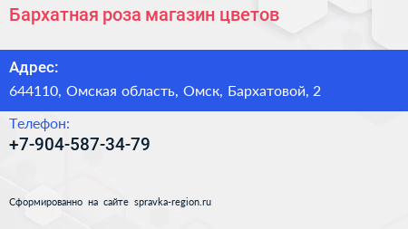 Бархатная роза, магазин цветов по адресу 644110, Омская область, Омск, Бархатовой, 2 в дальнейшем Организация, размещена в следующих категориях: