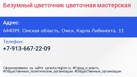 Безумный цветочник, цветочная мастерская по адресу 644099, Омская область, Омск, Карла Либкнехта, 11 в дальнейшем Организация, размещена в следующих категориях: