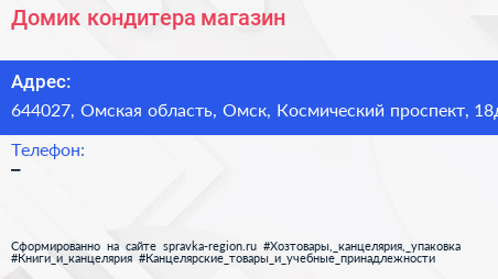 Домик кондитера, магазин по адресу 644027, Омская область, Омск, Космический проспект, 18д в дальнейшем Организация, размещена в следующих категориях: